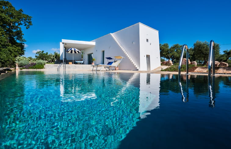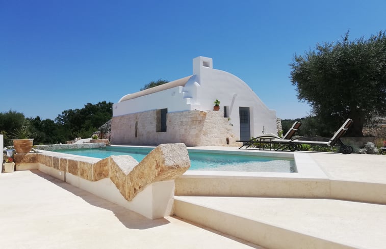 Design woning met een open uitzicht over de Valle d'Itria waar de zogenaamde trulli staan. Verdeeld over een oude kleine woning die los staat van de grotere woning. Ontworpen door de Belgische architect Gilles Therer. Privé zwembad van 14 meter lang. Wijngaard en olijfbomen op het terrein. Prive parkeren. Groter gedeelte heeft een open karakter maar ruimte voor veel personen. Het huis bestaat uit een hoofdgedeelte met plek voor 4 tot 6 personen en 2 badkamers. Er is ook een apart huisje...